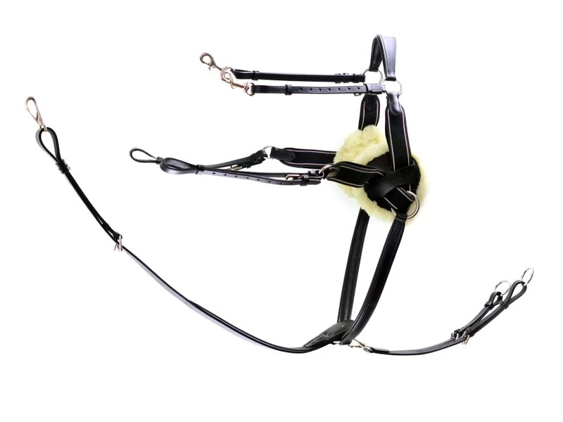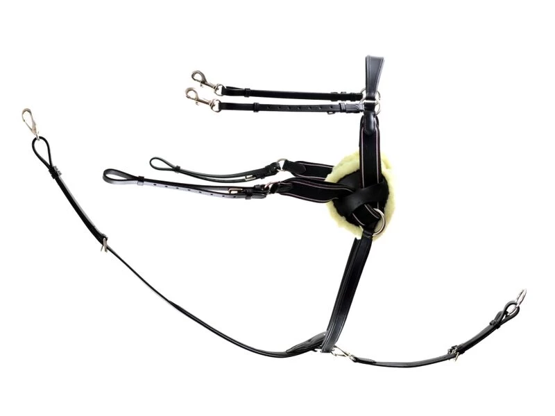 Leather 5 Point Breast Plate with 1.5″ wide elastic inserts, complete with detachable running martingale and fully adjustable straps. The unique way of positioning this Breast Plate is very benefical for keeping your saddle in place on the steep inclines on a cross country course. It is padded on the points with synthetic fur to prevent chaffing.
