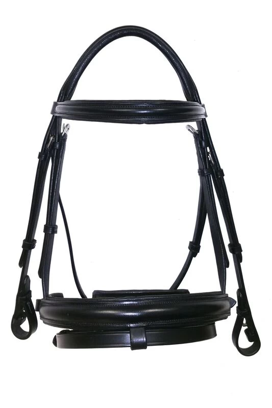 It has a comfort padded head piece, browband and noseband. The noseband is crank style, with two shorter buckled side straps, as the head piece has cheek and noseband straps each side. This eliminates the need for an over the head strap and helps avoid poll pressure. It also makes the bridle more balanced with even pull each side. The crank flash noseband has roller buckles each side and a padded chin pad; this makes it easier to tighten and more comfortable for the horse.