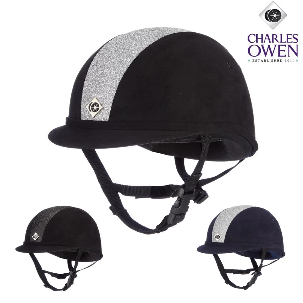 Charles Owen is excited to announce a brand new sparkly option for the YR8 – the perfect hat to make you shine in the arena or add a bit of sparkle to your everyday riding kit. Made of a special sparkle fibre, the black bling and shiny silver centre seamlessly complement the black or navy microsuede side panels. The YR8 features four discreet ventilation holes for added comfort during extended periods of use and it comes in a fun Charles & Owen carry box.