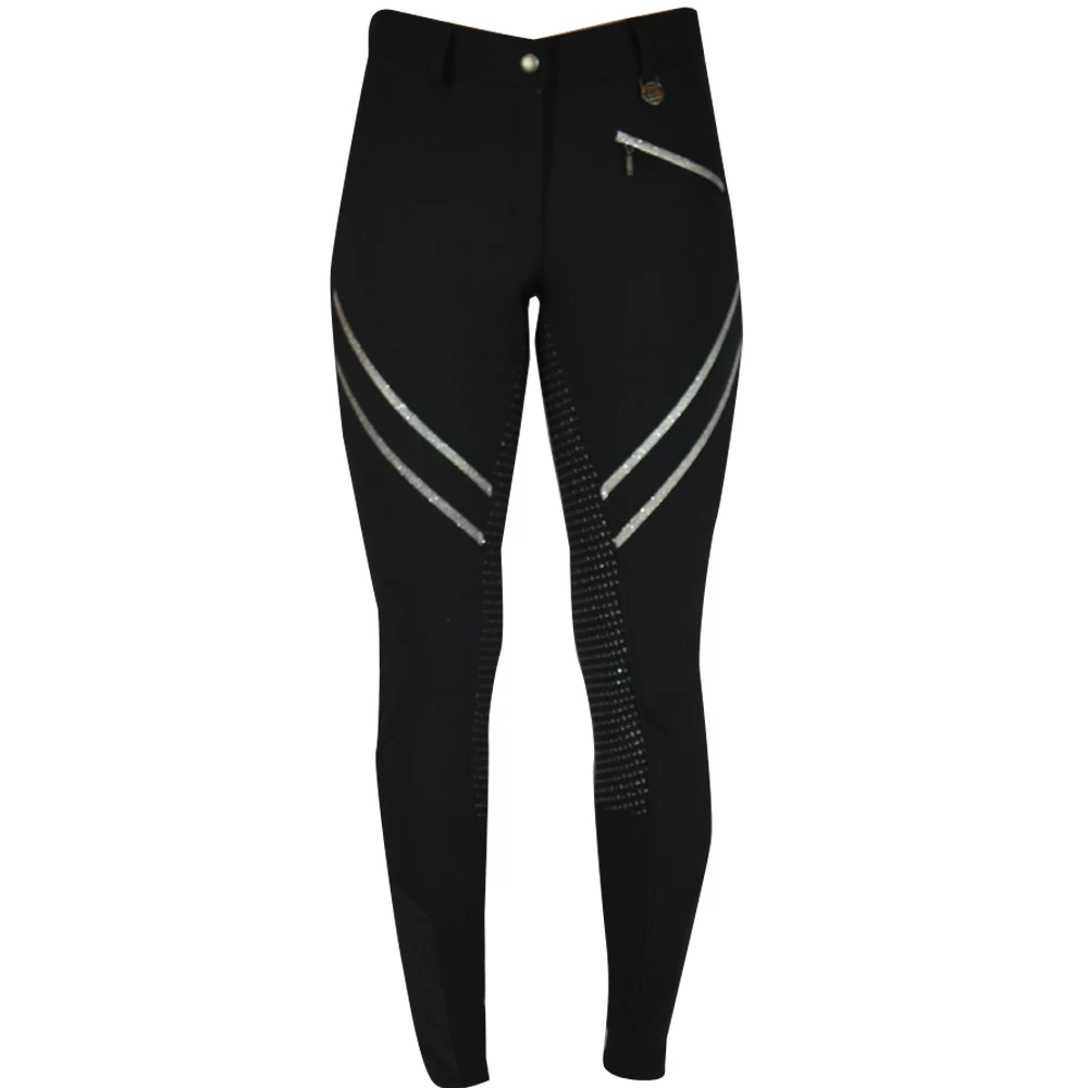 The Camila breeches are a stylish breech with a sparkly silver silicone full seat with two back pockets and a front pocket. With two stripes at the front to give a bit more wow factor. You can compete in the white breeches or have the black ones for everyday stable use. Super comfy and stytlish.