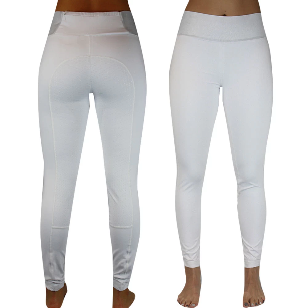 The Eileen Douglas Morgan Riding Tights are a pair of comfy and fashionable competition tights. They offer flattering support due to the wide silver waistband, also include full silicon pattened seat. These tights are also made with double layers to ensure they are not see through when on or when wet, making them ideal for competitions.