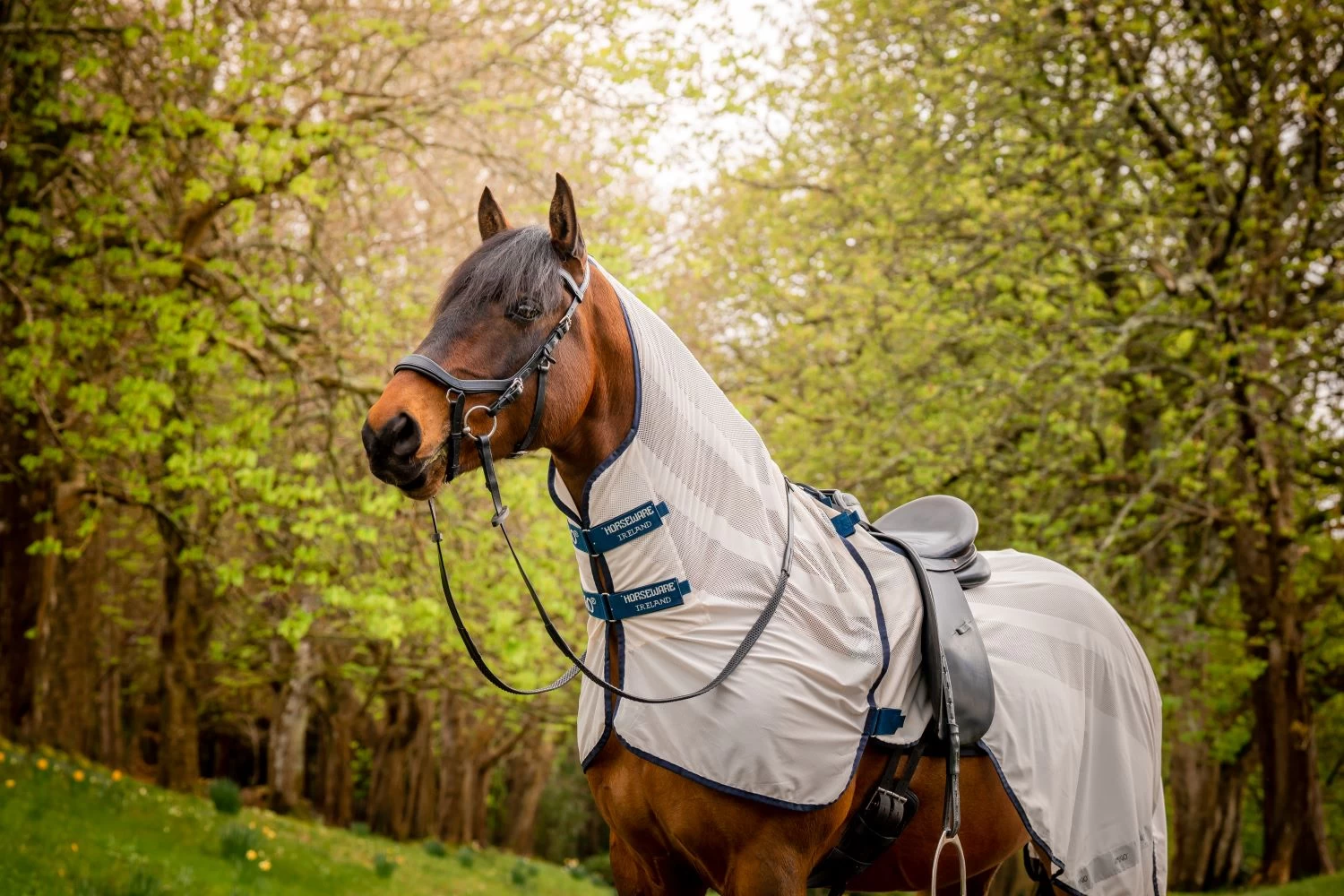 Protect your horse from flies while you ride. Lightweight and soft skrim polyester fabric, easy to use Velcro closures. Protects the horse from flies while riding, contoured body shape fits around saddle and allows room for the riderโs leg. Detachable easy-open large hood to protect horseโs neck and shoulders, loop to attach to bridle during exercise, reflective safety strips.