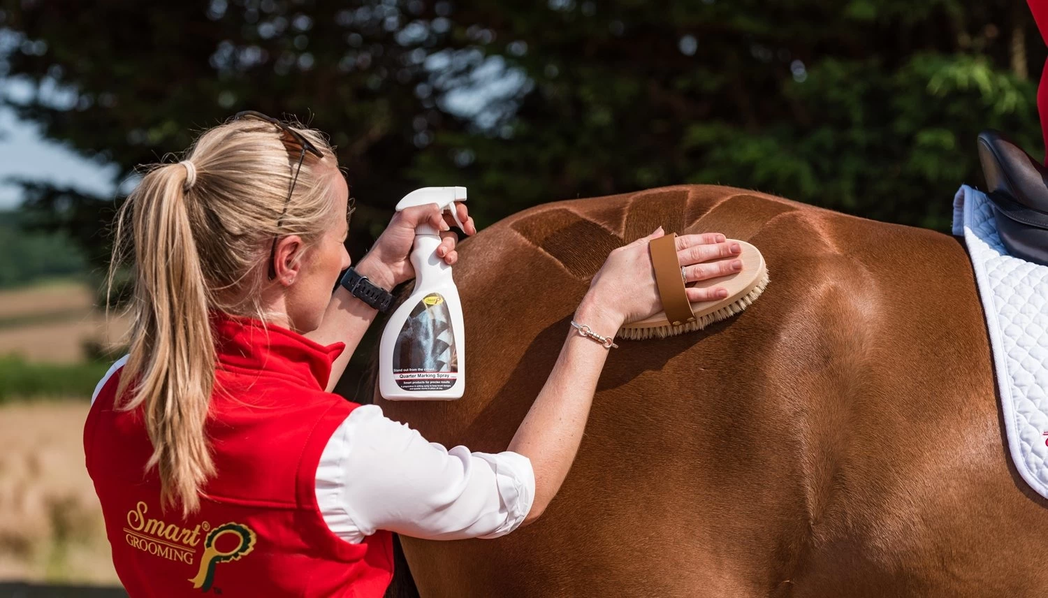 Designed to set and hold quarter marks and brush designs in place all day ensuring a perfect final finish. Will hold brush designs in place all day without leaving a sticky residue and even when taking rugs on and off. Apply liberally to area that requires marking. Use comb, slicker or brush to apply markings. Re-spray over final marks. Allow to dry.