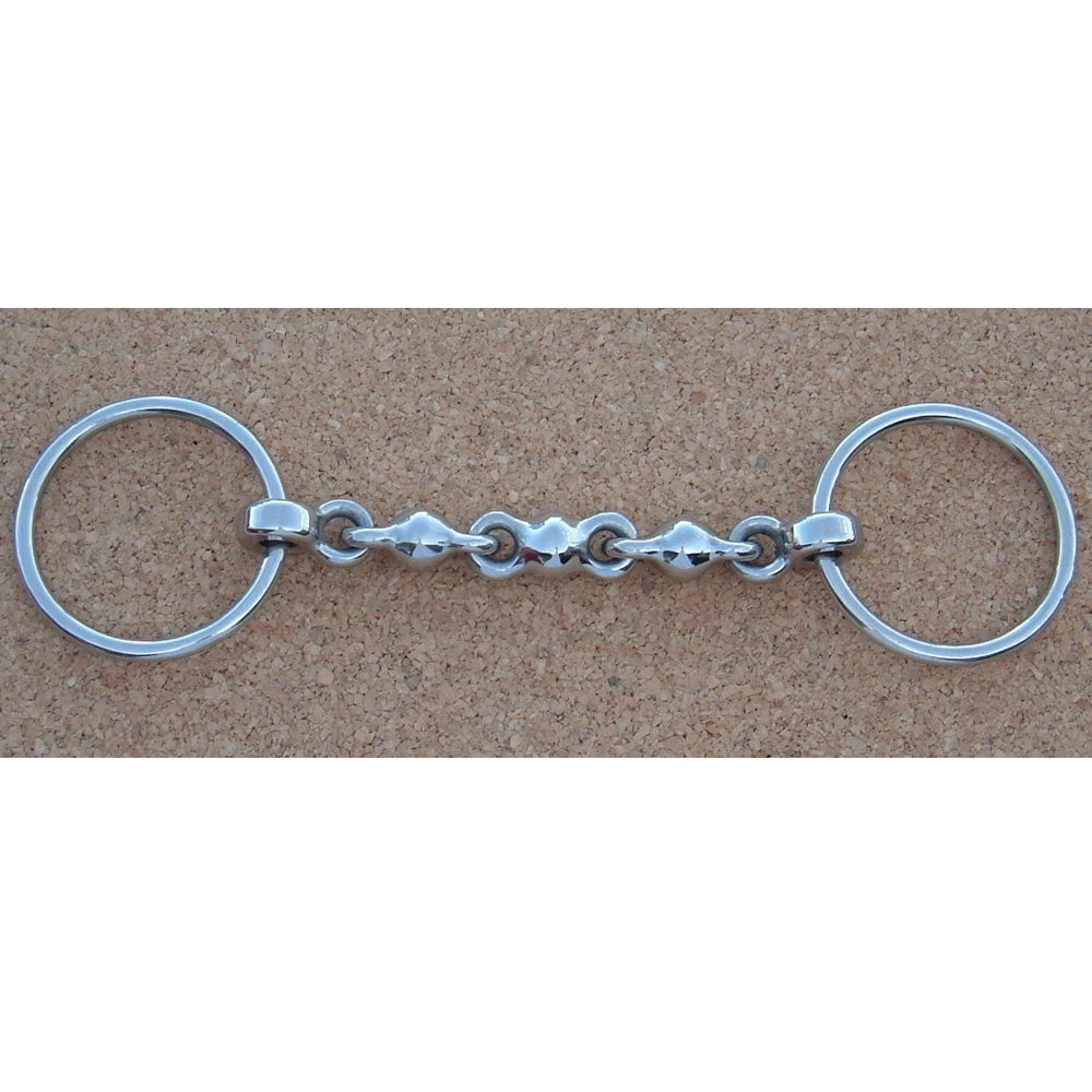 This bit has a chain type mouthpiece which has ball shaped links linked together, the bit is floppy and mobile in everyway, it is completely movable in all directions. The Waterford mouthpiece has proved one of the most popular bits for bitting problems such as leaning, taking hold of the bit, setting the jaw ect, when the horse tries to lean or take hold of the bit, the waterford mouthpiece collapses, thus the horse has nothing rigid to take hold of. It encourages the horse to work of their quarters and carry themselves rather than using the bit as a bike handle to lean on. This bit has several joints and distributes the pressure of the mouthpiece over both the tongue and bars. Also this bit may look severe, this is quite a mild bit and due to the mobility of the mouthpiece it generally suits any breed of horse and mouth confirmation. The Waterford mouth should be worn โ longer than any other mouthpiece as the mouthpiece needs to curl slightly around the lips to enable the bit to work to its full potential (except the Waterford Pelham as the mouthpiece is worn the normal length).