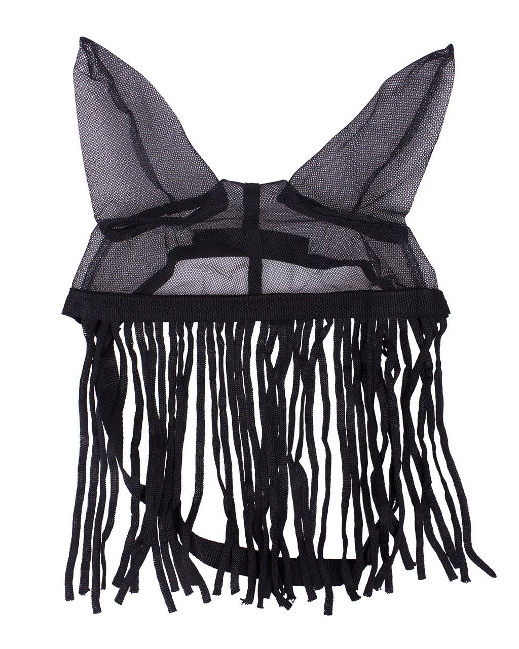 Anti-fly fringe which features fine mesh ears and an elastic throat latch. The fringe can be used without head collar due to the throat latch.