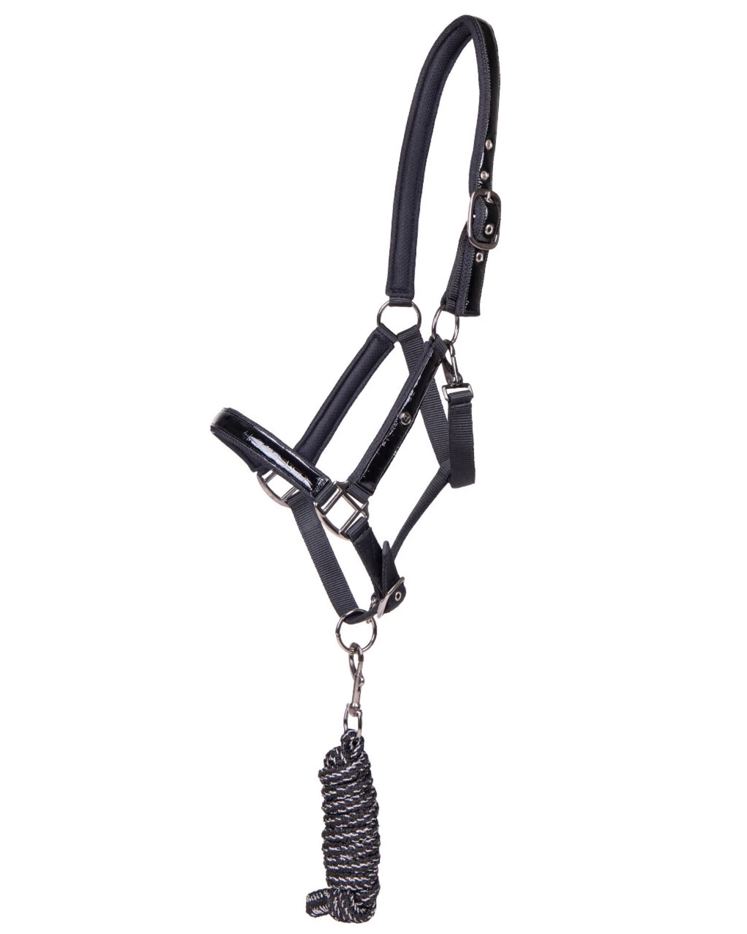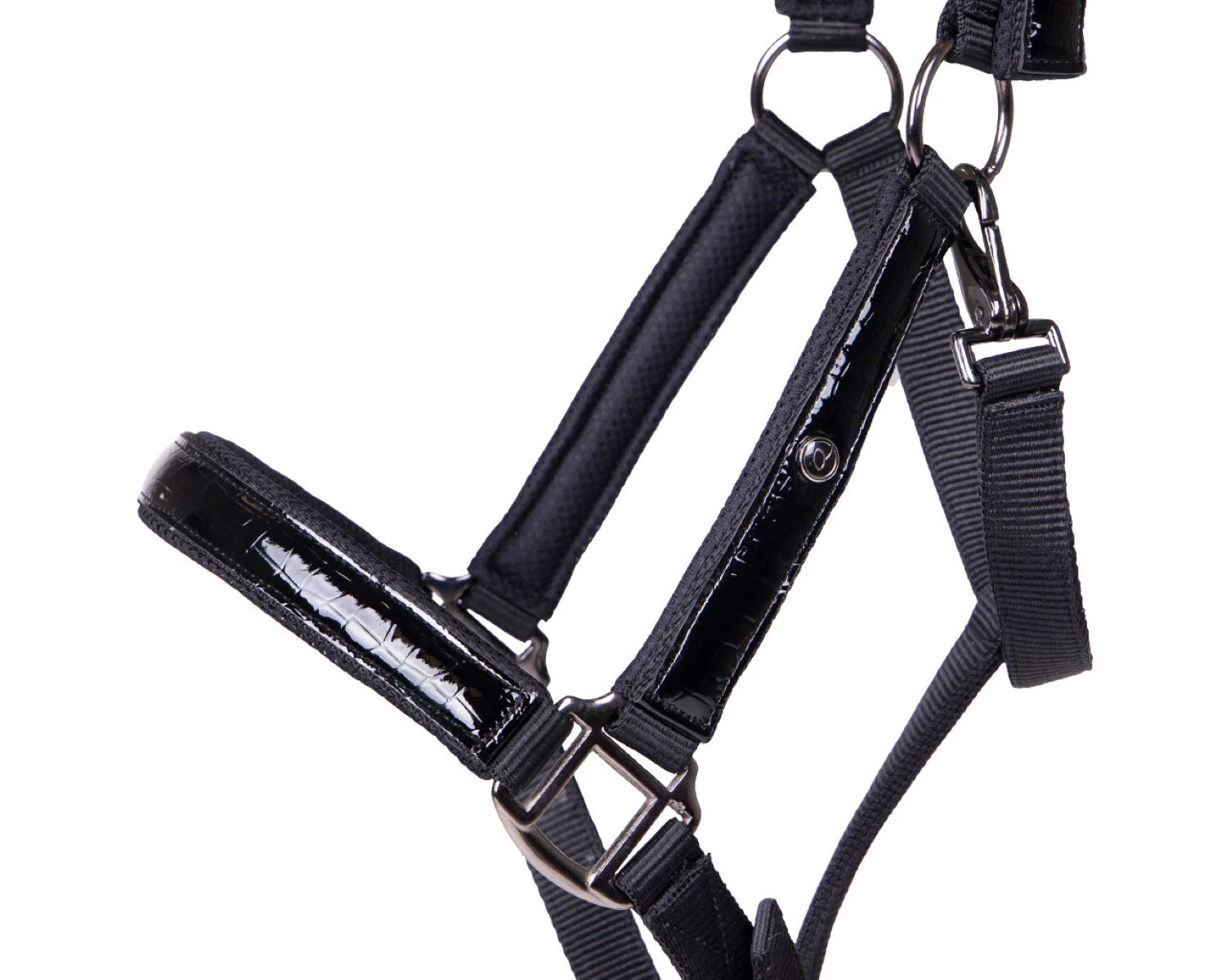 Elegant head collar set from the Djune collection. With its patent leather croco noseband, mouthpieces and headpiece, this head collar is a real must-have! It is finished with a luxurious Q-pin and a mesh inside.