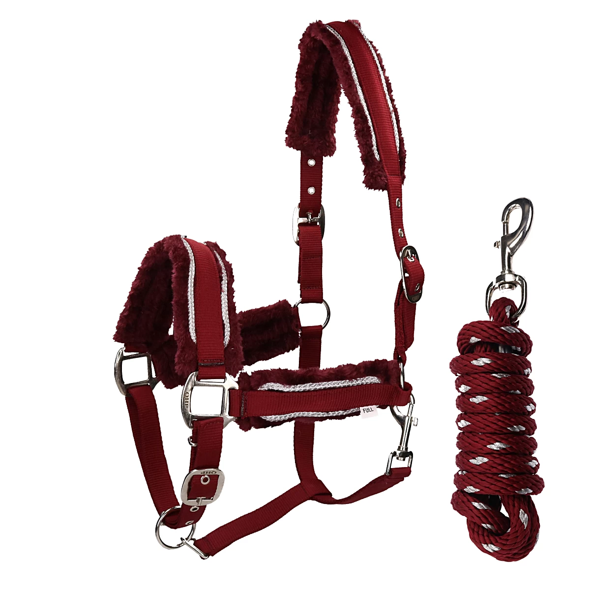 The rope with snap closure has silver accents. The head collar is adjustable on the noseband and crown piece.