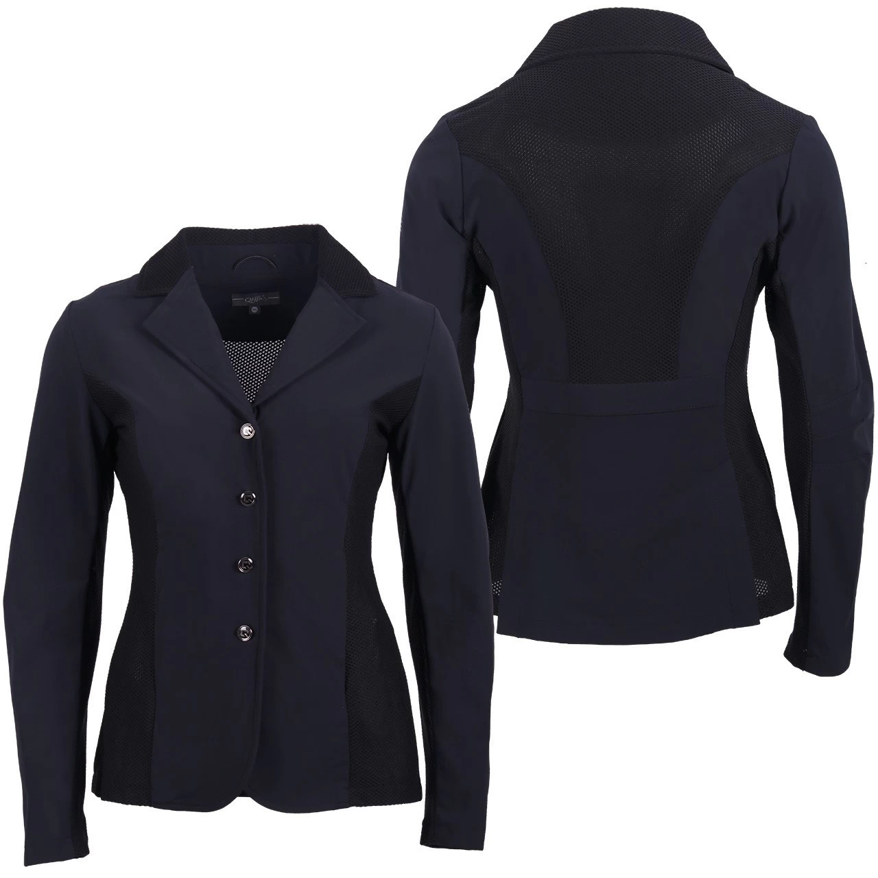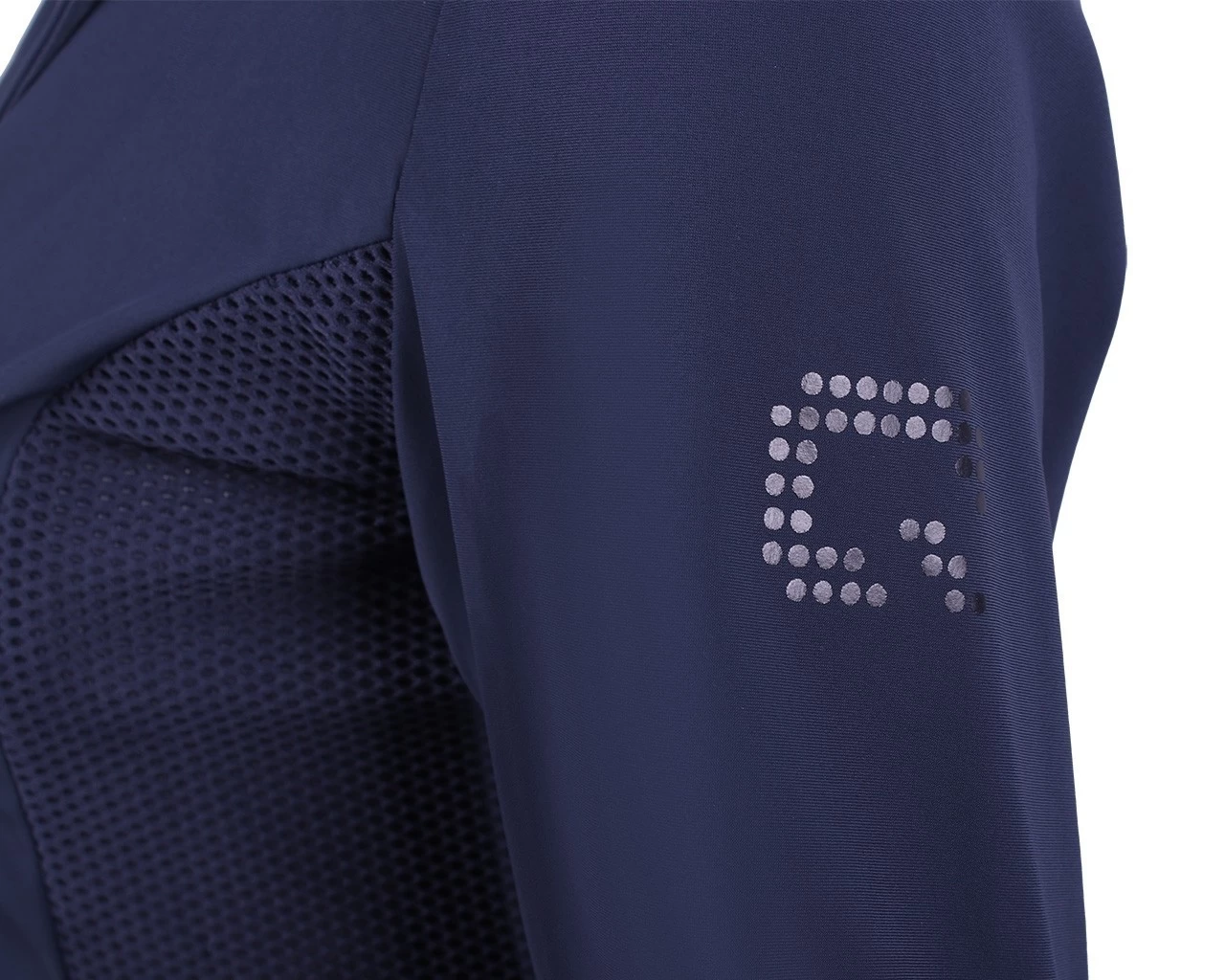 Sporty competition jacket with mesh on the sides, under the sleeves, on the rear and collar. The mesh makes the jacket very breathable and perfect for summer. The jacket features a hidden zipper behind the button closure and two hidden zipper pockets on the front.