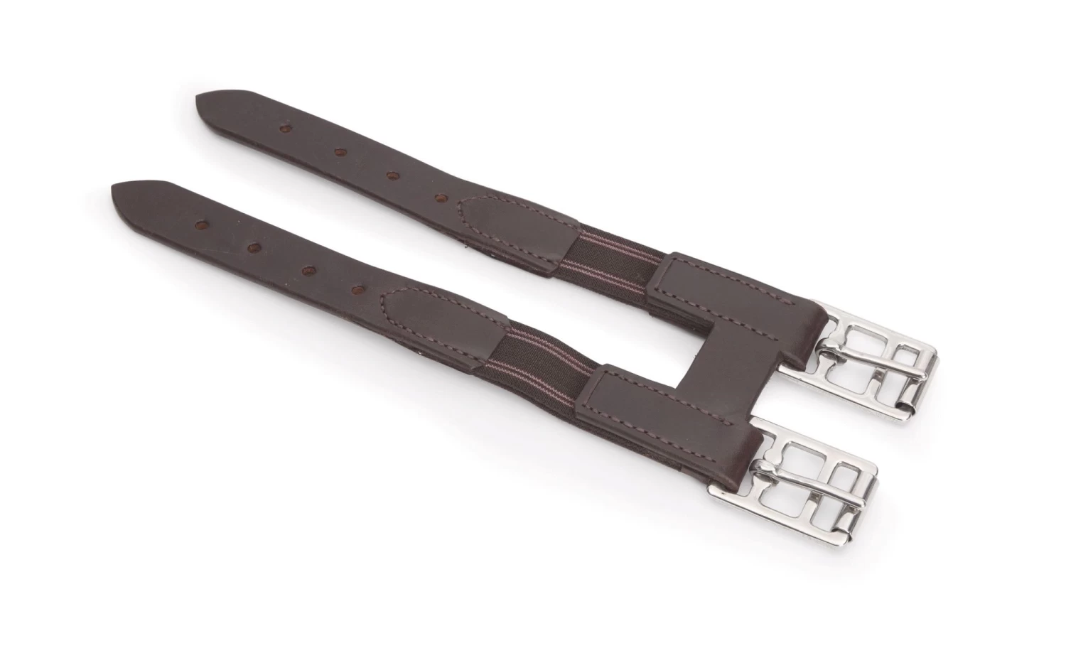 Velociti GARA leather girth extension with double layer elastic inserts help alleviate pressure and pinching when attached to a standard girth. Twin roller stainless steel buckles.